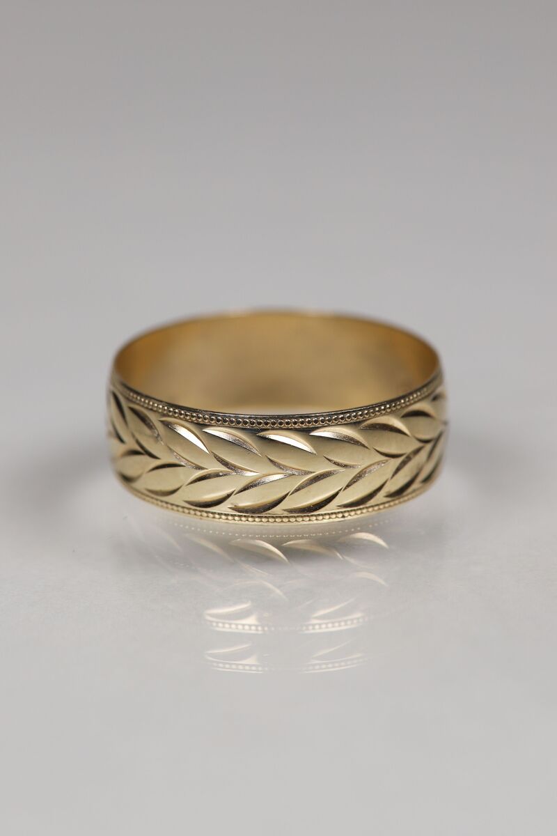 A vintage 9ct gold leafy band ring with milligrain edging. The ring was made in London, circa 1970.