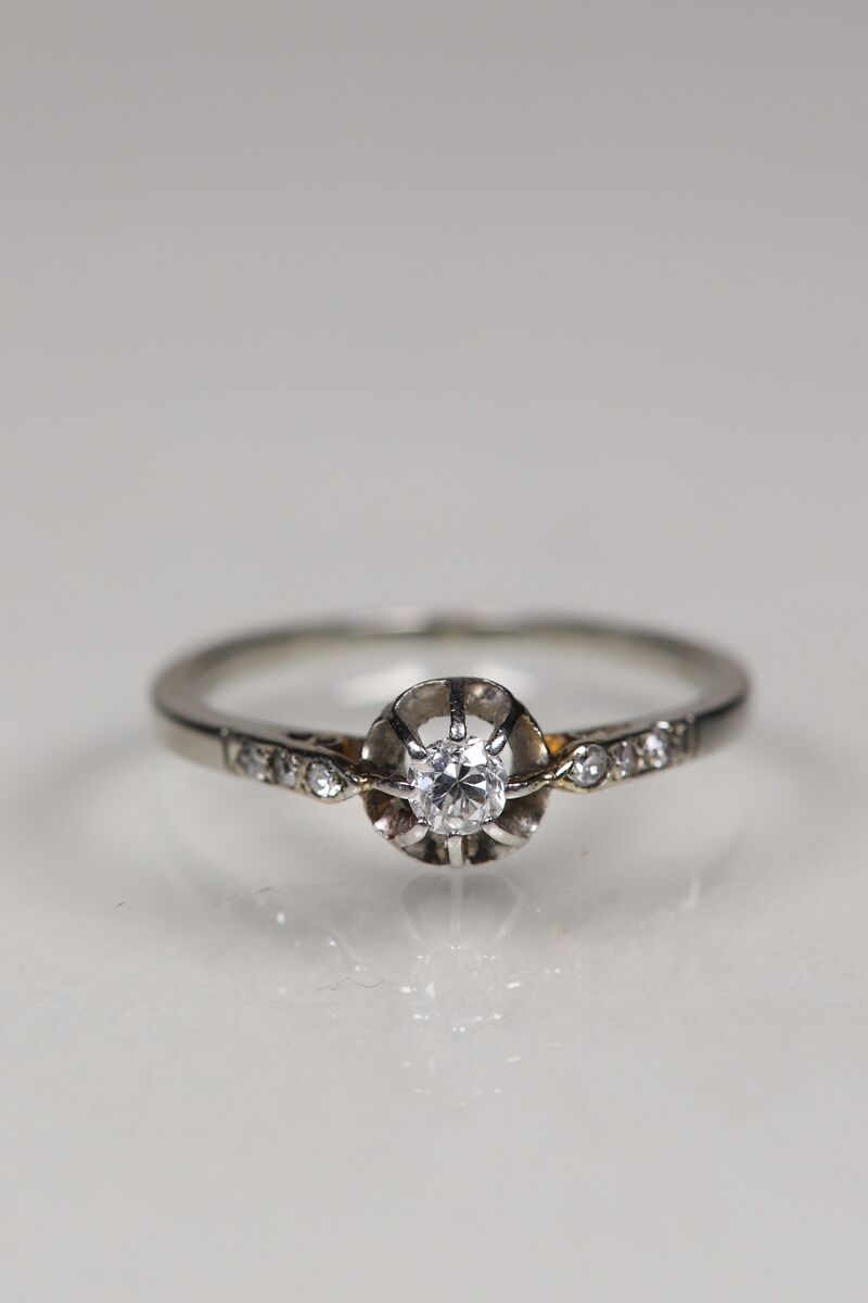 A stunning Art Deco 18ct white gold old cut diamond 'buttercup' ring. Many people refer to these settings as different names, pie crust is a favourite. Or belcher! I personally think it looks like a little flower. You'll find three further sparkling diamonds on either shoulder too. A dainty nod to the Deco era.