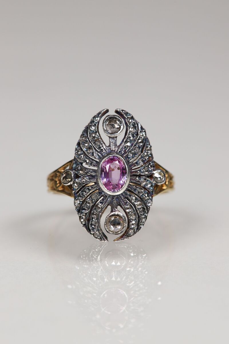 An Art Nouveau inspired 18ct gold pink sapphire and rose cut diamond ring. The stones are set in silver. I love the way the design looks like wings!